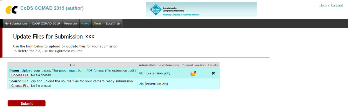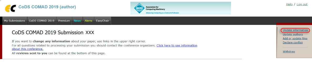 After you upload the files, update your conference registration transaction ID in the 'Update Information' tab for your CoDS COMAD article. Articles which do not have a registration by at least one author will be removed from the proceedings.